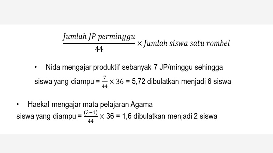 Hal yang perlu diperhatikan dalam pembagian jam pelajaran (JP) guru pembimbing adalah beban kerja guru yang menjadi prioritas adalah yang sesuai dengan sertifikasi guru, jam pelajaran disesuaikan dengan beban mengajar mata pelajaran yang diampu masing-masing guru kelas XII sehingga beban mengajar/ total alokasi JP yang diinput ke Dapodik selama 1 tahun sama. Mata pelajaran yang diampu diganti menjadi mapel PKL saat pelaksanaan PKL berlangsung, tidak perlu menghitung ulang beban kerja masing-masing guru.